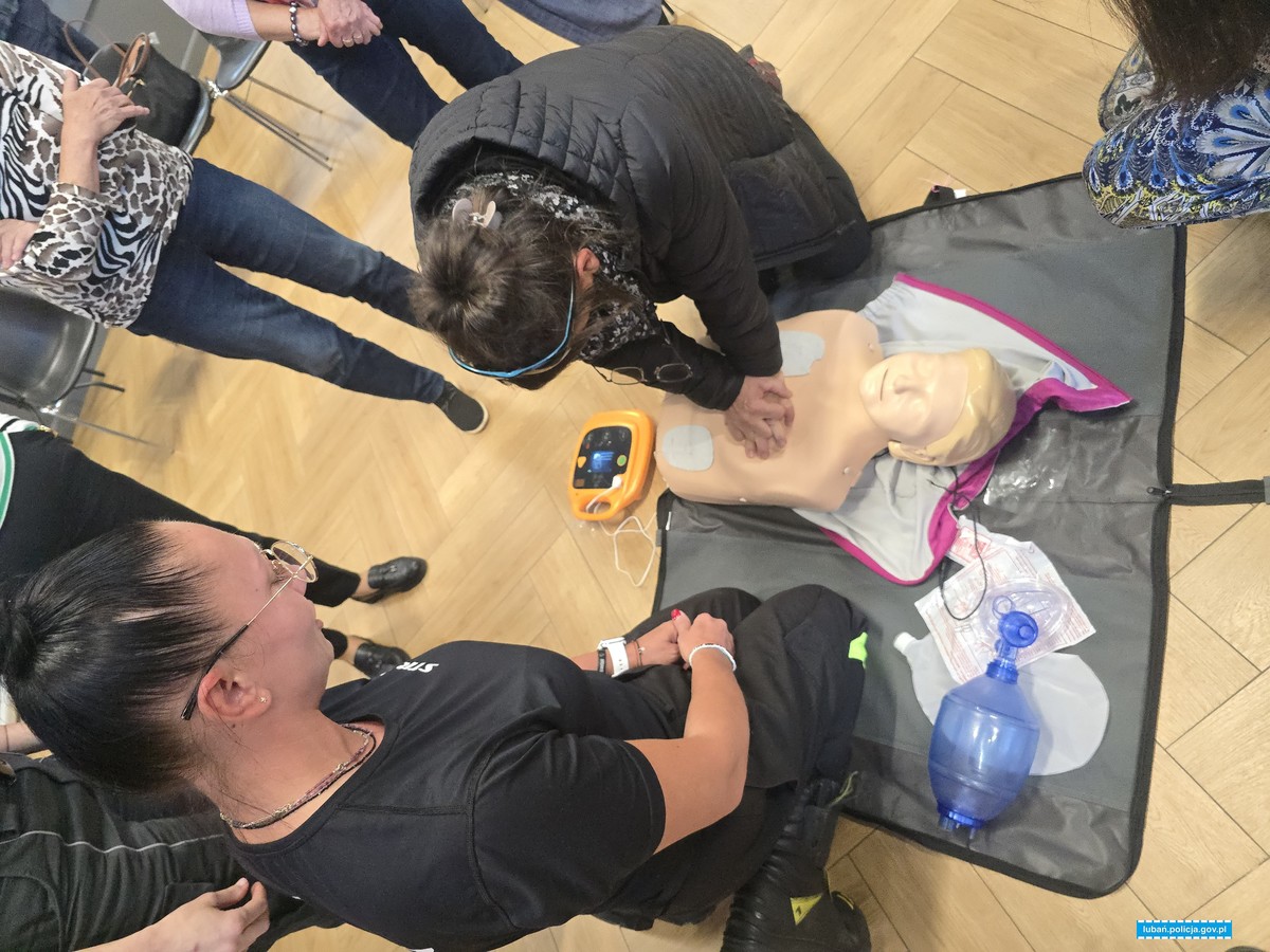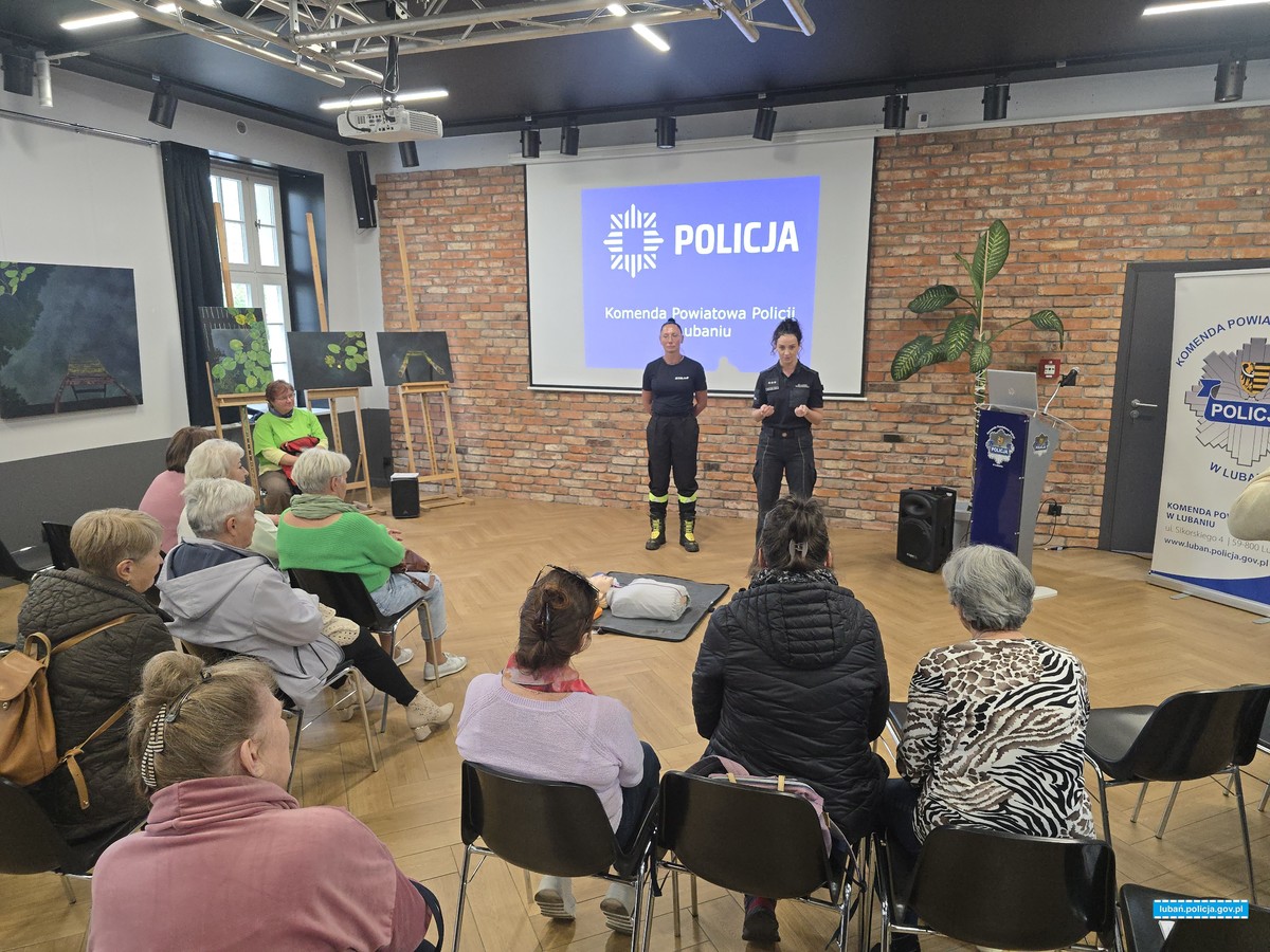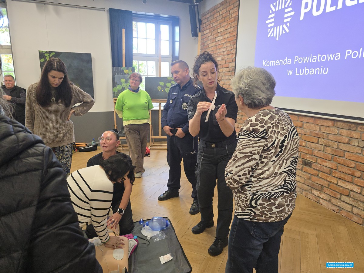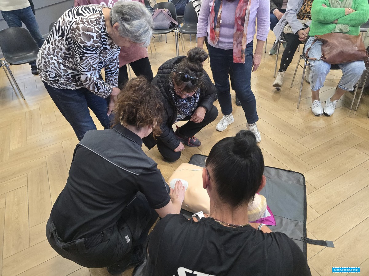 W trakcie spotkania przypomniano także o narzędziach zwiększających bezpieczeństwo mieszkańców. Należą do nich Krajowa Mapa Zagrożeń Bezpieczeństwa, gdzie można anonimowo zgłosić niepokojące zjawiska oraz aplikacja Moja Komenda, umożliwiająca szybki kontakt z lokalnymi policjantami. Wiele przydatnych porad w kwestii związanych z świadczeniami dla seniorów, emeryturami i zasadami bezpiecznego korzystania z usług ZUS, naszym seniorom udzieliła Pani Lidia Iwańska z Zakładu Ubezpieczeń Społecznych Inspektorat w Lubaniu. Oprócz rozmów o zagrożeniach związanych z oszustwami odbył się również praktyczny pokaz udzielania pierwszej pomocy wykonaniu chorąży sztabowej Kamili Turbak funkcjonariuszki z Zakładu Karnego z Zaręby oraz Pani Małgorzaty Kubś z Ochotniczej Straży Pożarnej w Świeradowie-Zdroju. Seniorzy mieli okazję nie tylko obserwować pokaz, ale również sami spróbować podstawowych czynności ratujących życie pod okiem specjalistów. Jak podkreślali prowadzący, szybka i właściwa reakcja świadka zdarzenia może uratować ludzkie życie.