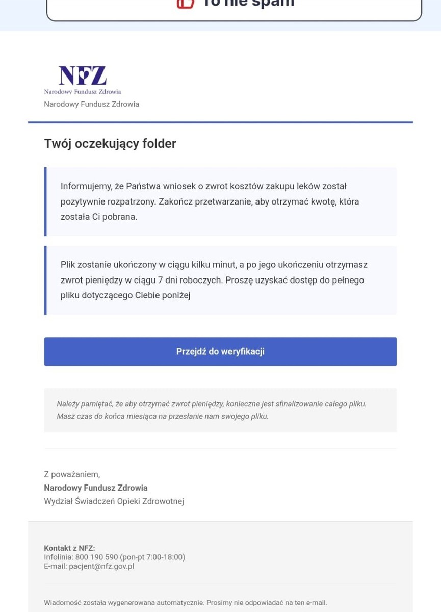 Wiadomość e-mail rzekomo wysłana przez NFZ, to tak naprawdę kampania phishingowa, która wyłudza dane i pieniądze. Wygląda to tak, że na skrzynki e-mailowe trafiają rozsyłane wiadomości, w których odbiorca proszony jest o wciśnięcie przycisku „"Przejdź do weryfikacji" i wtedy rozpoczyna się proces wyłudzenia danych.